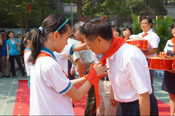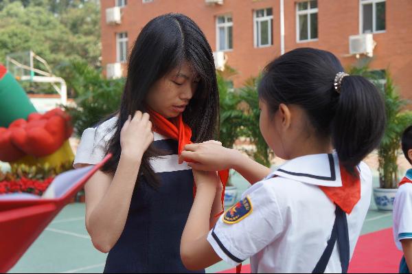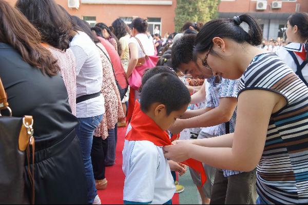活动当天,学校特意邀请了部分学生家长参与活动。一年级同学的家长们还亲手为自己的孩子戴上了鲜艳的红领巾,并送给孩子一句真挚的祝福语,预祝他(她)们在林大附小少先队这个团结、进取、快乐的集体中能够茁壮、健康的成长。