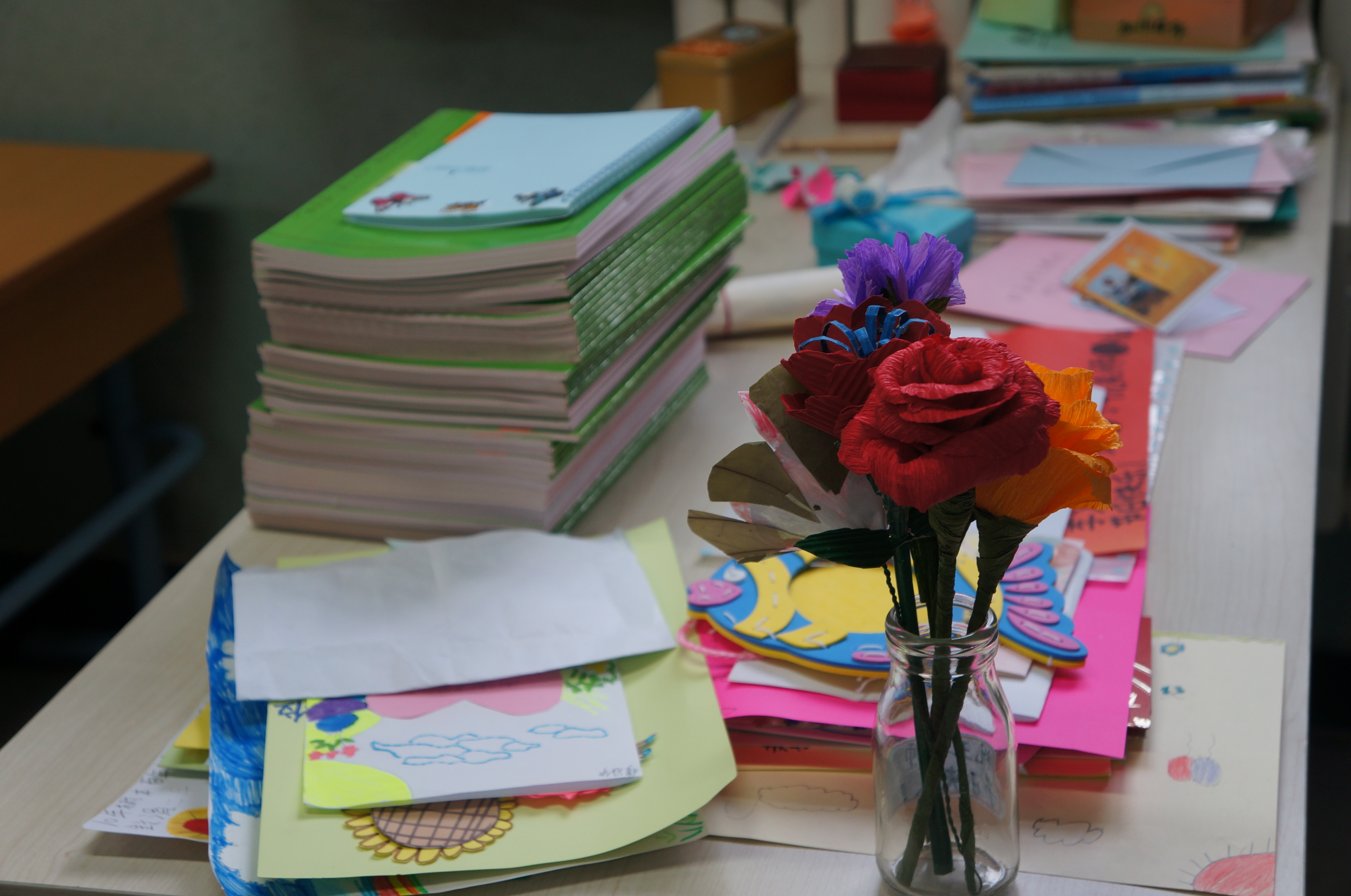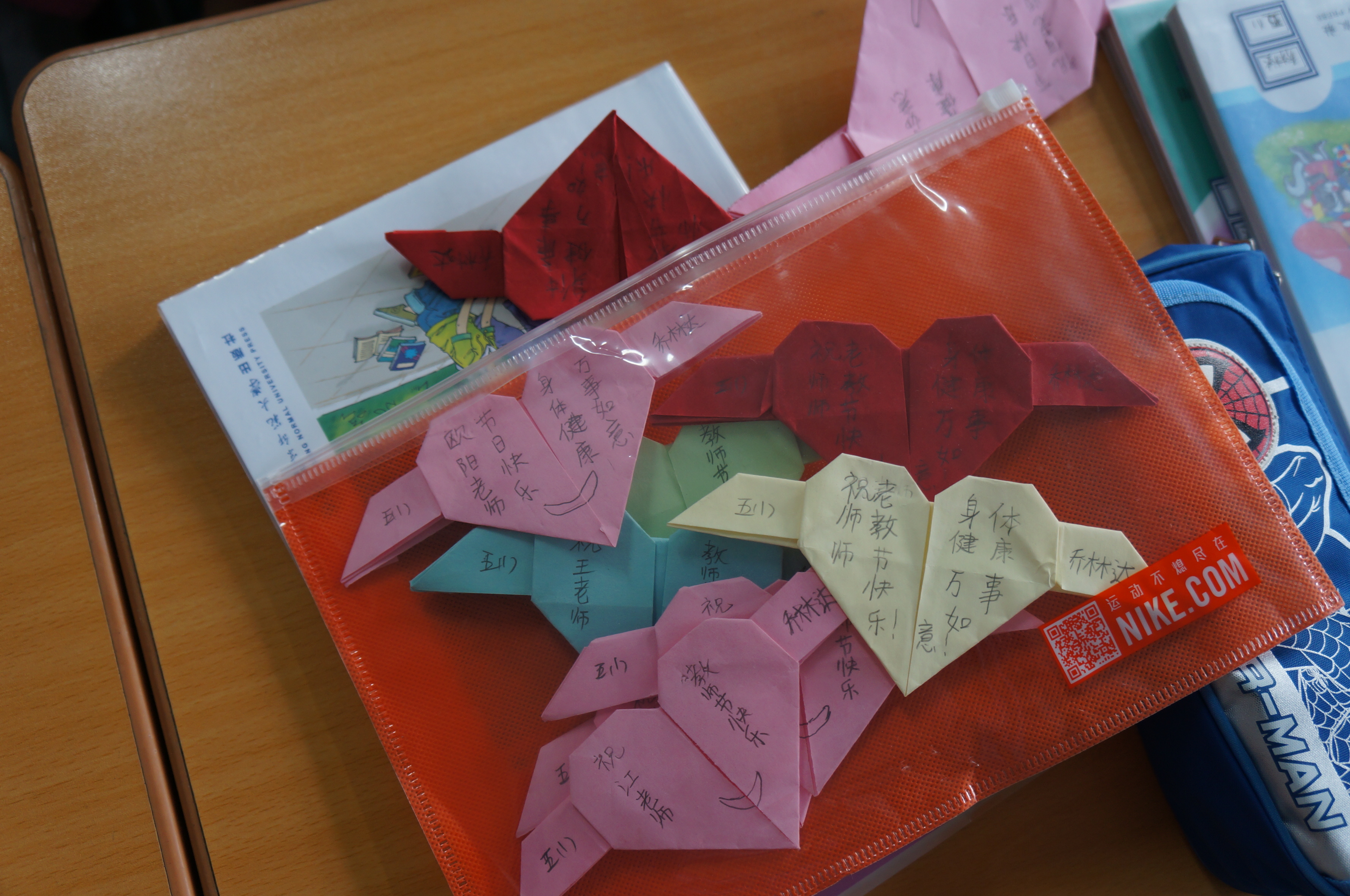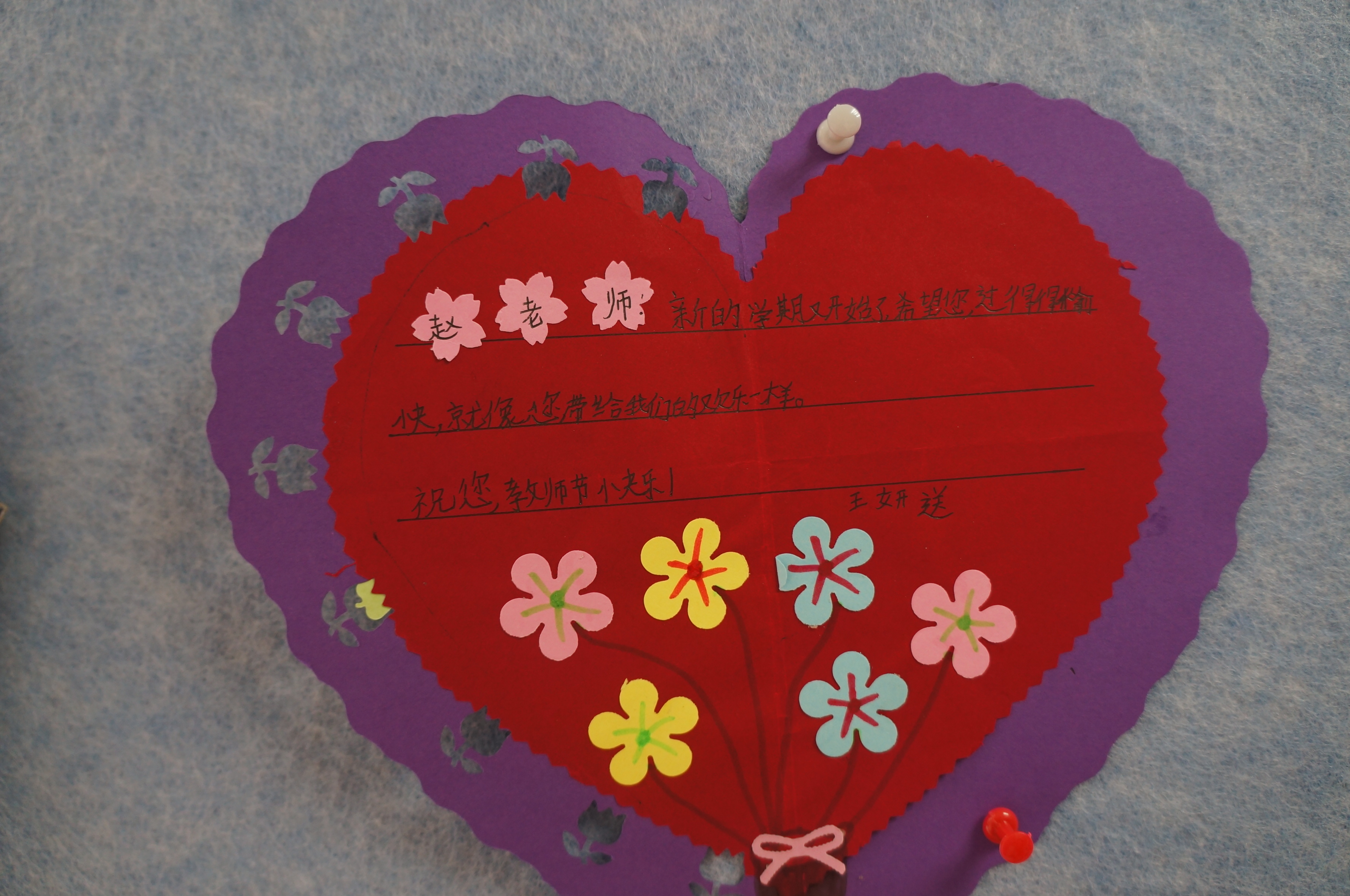 情意浓浓的礼物真是玲琅满目啊:有的用稚嫩的文字倾吐出和老师讲的知心话儿,有的用艳丽的彩笔描画出真挚师生情,有的叠了朵朵鲜花,还有的甚至烘烤出片片面包……