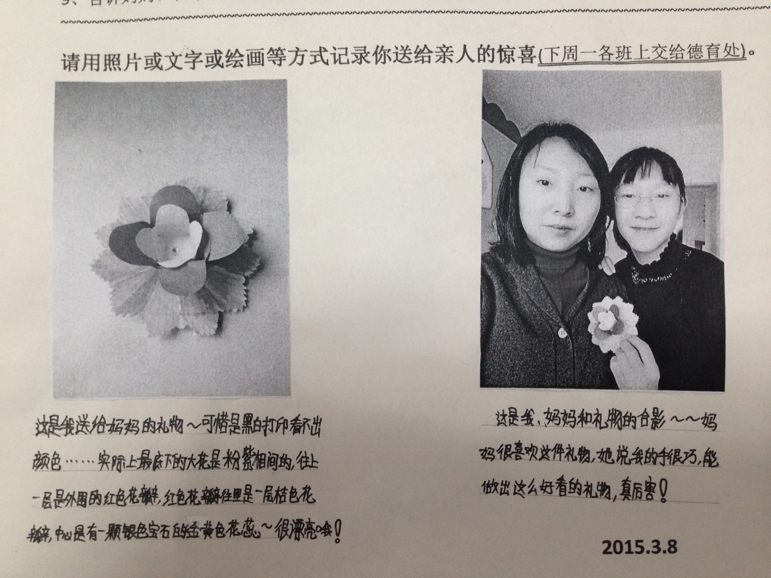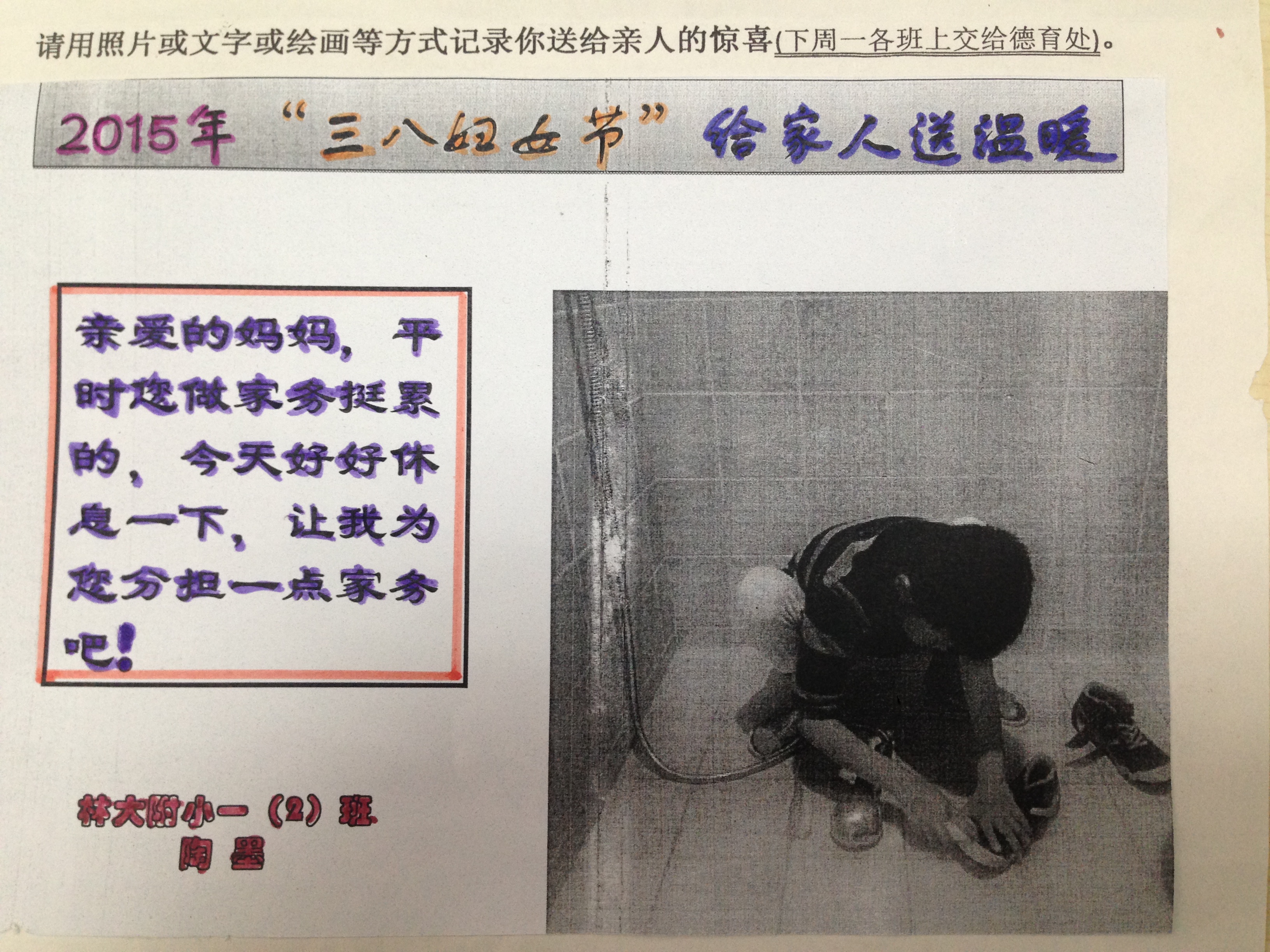 每年的三八妇女节,我校德育处总会号召全校的孩子们行动起来。今年开展了“友善温暖人温暖你我”的纪念三八节的特别活动-----送惊喜。
