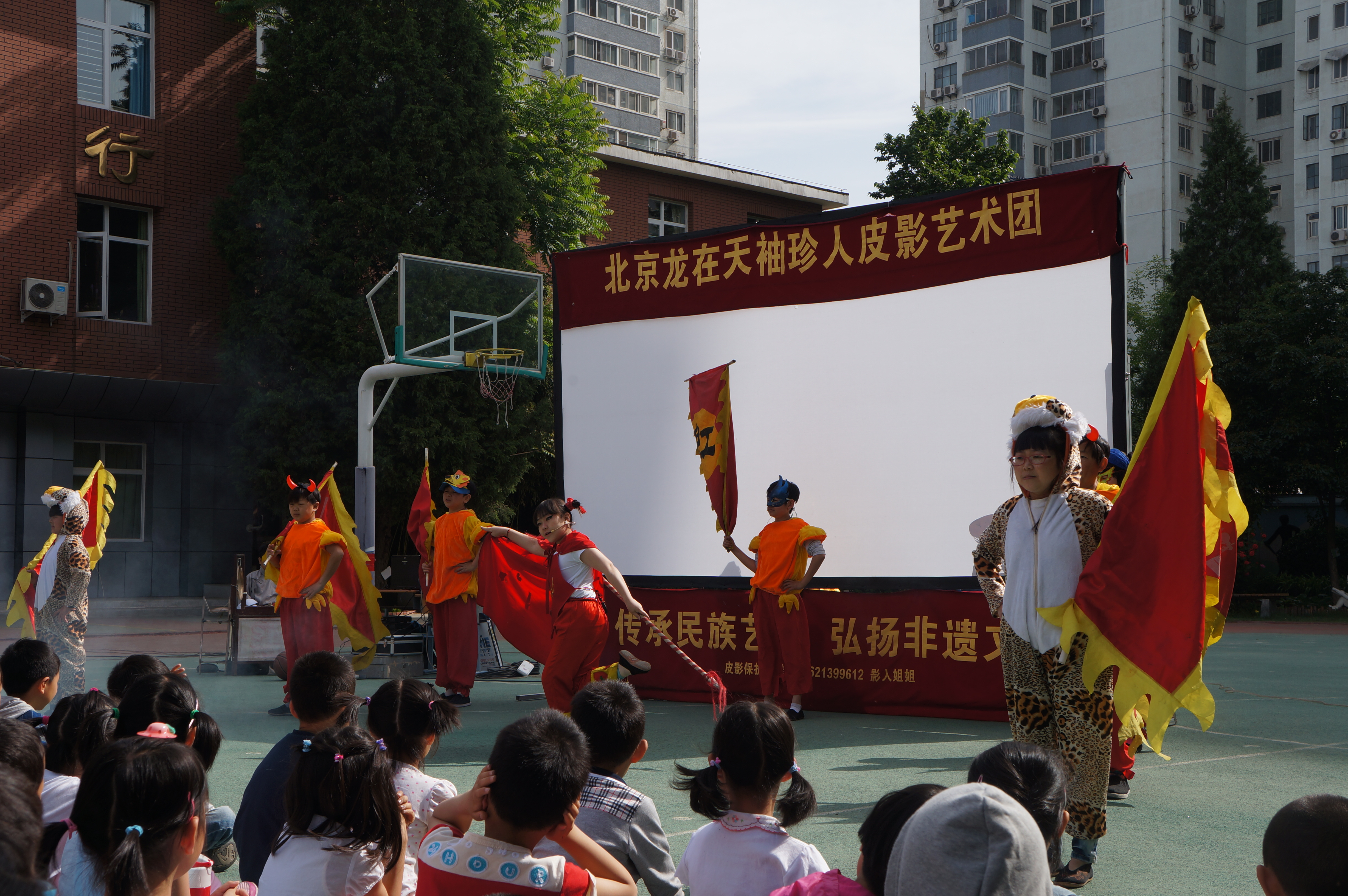 “嘻嘻嘻––哈哈哈––”,一阵阵密集的锣鼓声,同学们一阵阵的欢笑声,交汇在一起,林大附小的大操场变成了欢乐的剧场。原来,这是5月13日,北京龙在天袖珍皮影艺术团给我校师生送来了一场原创舞台皮影剧《红孩儿》。
