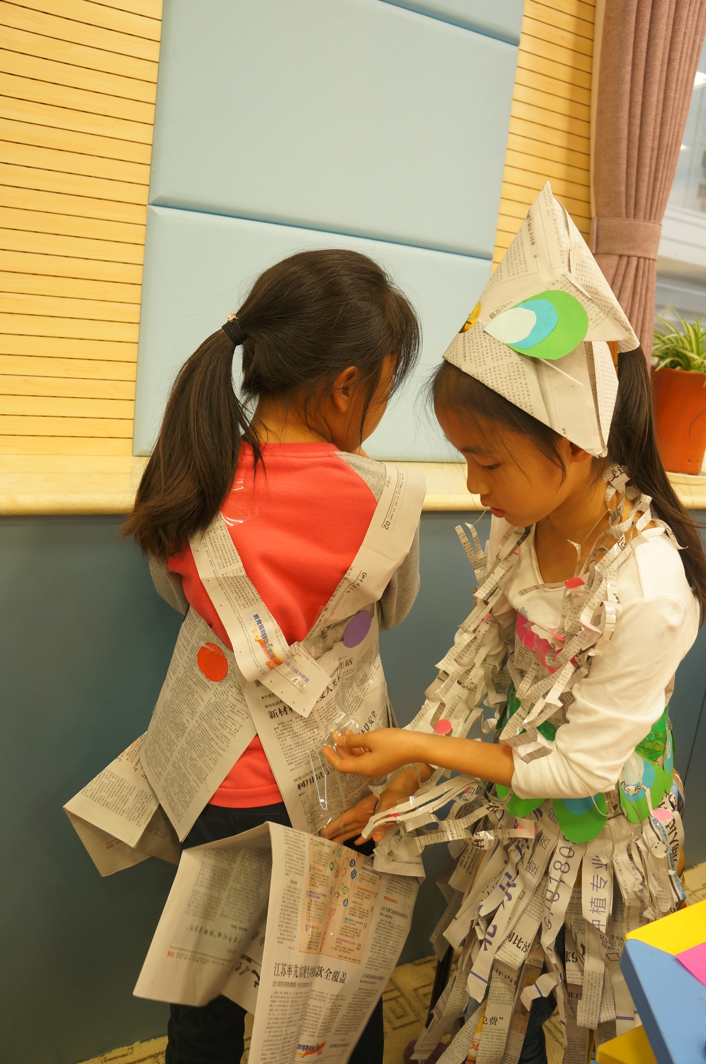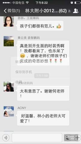 课程内容融合了多学科特点,围绕发展孩子的综合能力分成五个环节:了解纸的发展史,体会古代劳动人民的智慧;研讨环保的话题,感知“纸要节约用”;通过折、剪、贴、卷、拼接边条等多种方法,完成“报纸巧利用”的制作;踩着音乐的节奏,根据服装的造型,学走模特步,美美地秀“纸作品展示”,最后再上传作品照片,利用软件“美化纸作品”。整整两节课,惊喜不断,同学们分小组合作创新,踊跃动手动脑,提升了多方面的能力和素养,家长们也是称赞不已(微信截图附后)。