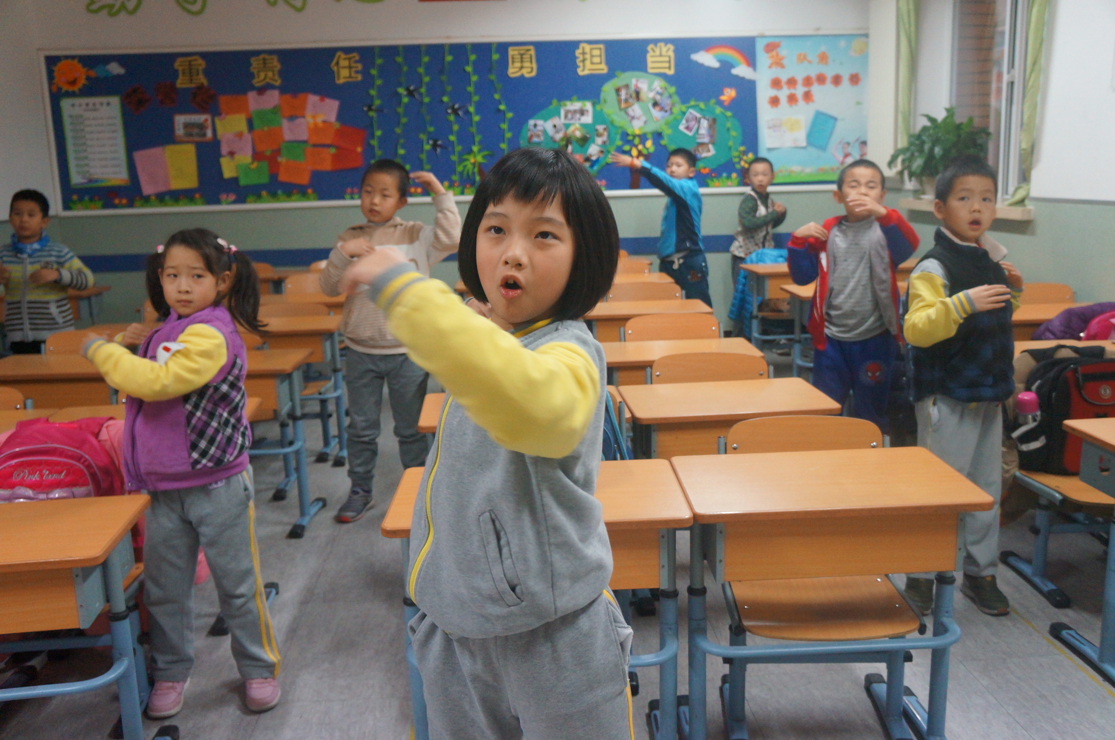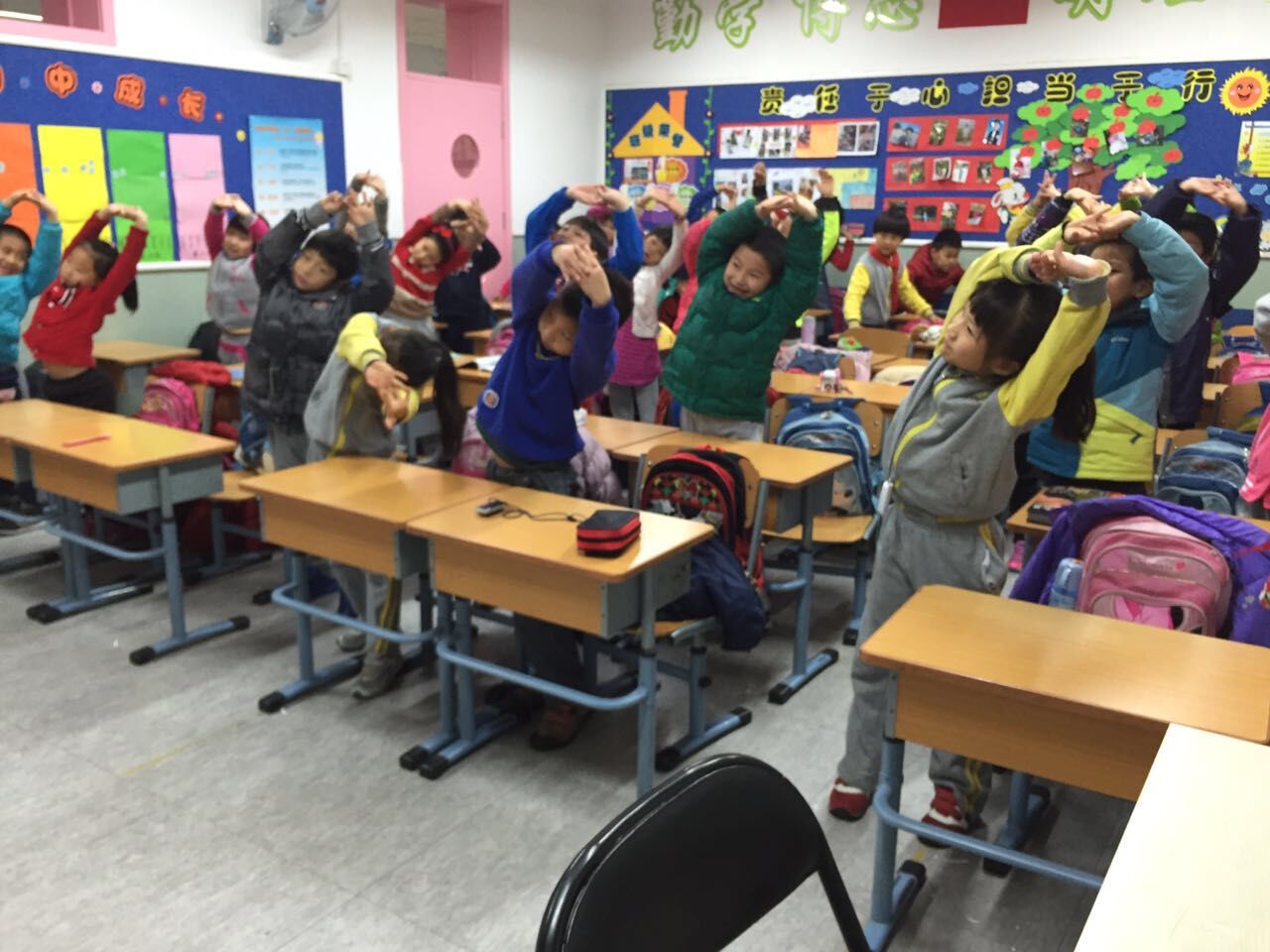 镜头三:体育课上欢声笑语不绝于耳。老师们开动脑筋,利用有限活动场所,组织同学们进行各种身体素质练习,开展室内操及各种游戏活动,千方百计保证每天的体育锻炼时间。伴随着韵律十足的音乐,花样翻新的的《关节操》、《泡泡操》、《手指操》……让孩子们忙得不亦乐乎:踢踢腿,弯弯腰,活动活动手腕,扭动扭动脖子,一会功夫就热汗直流。