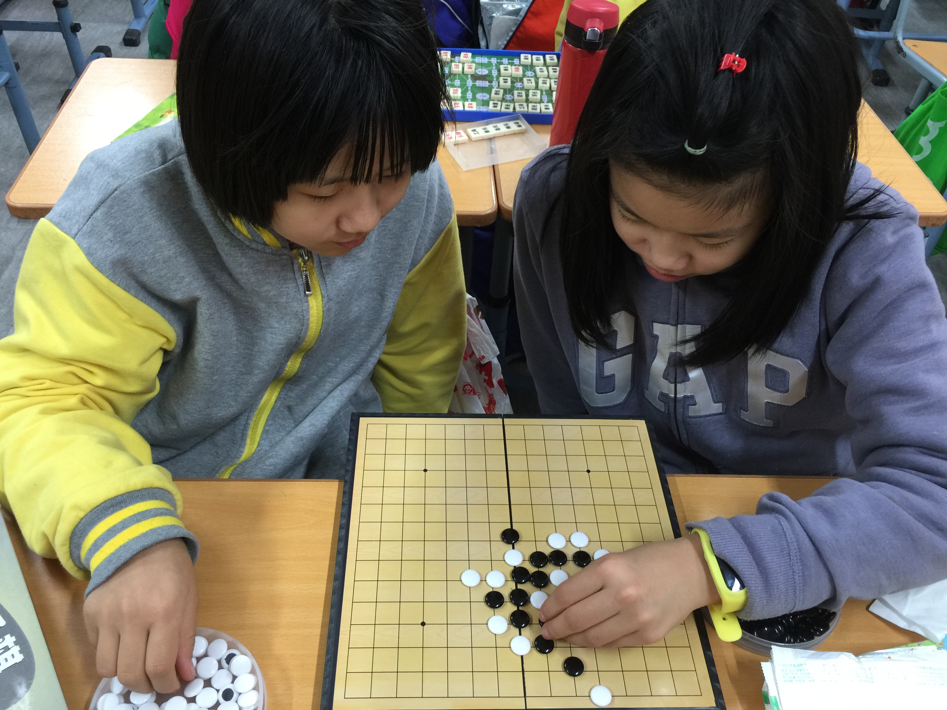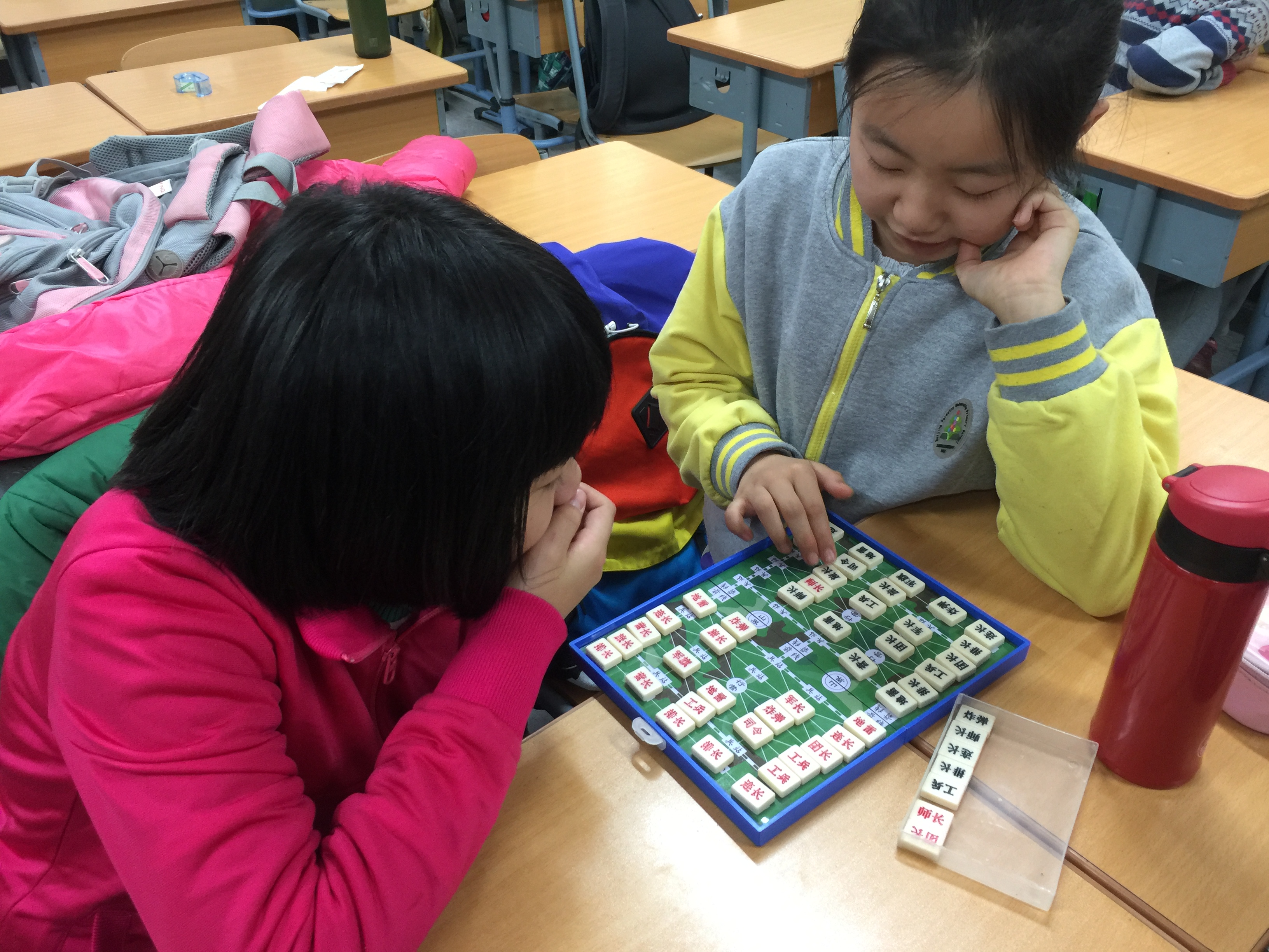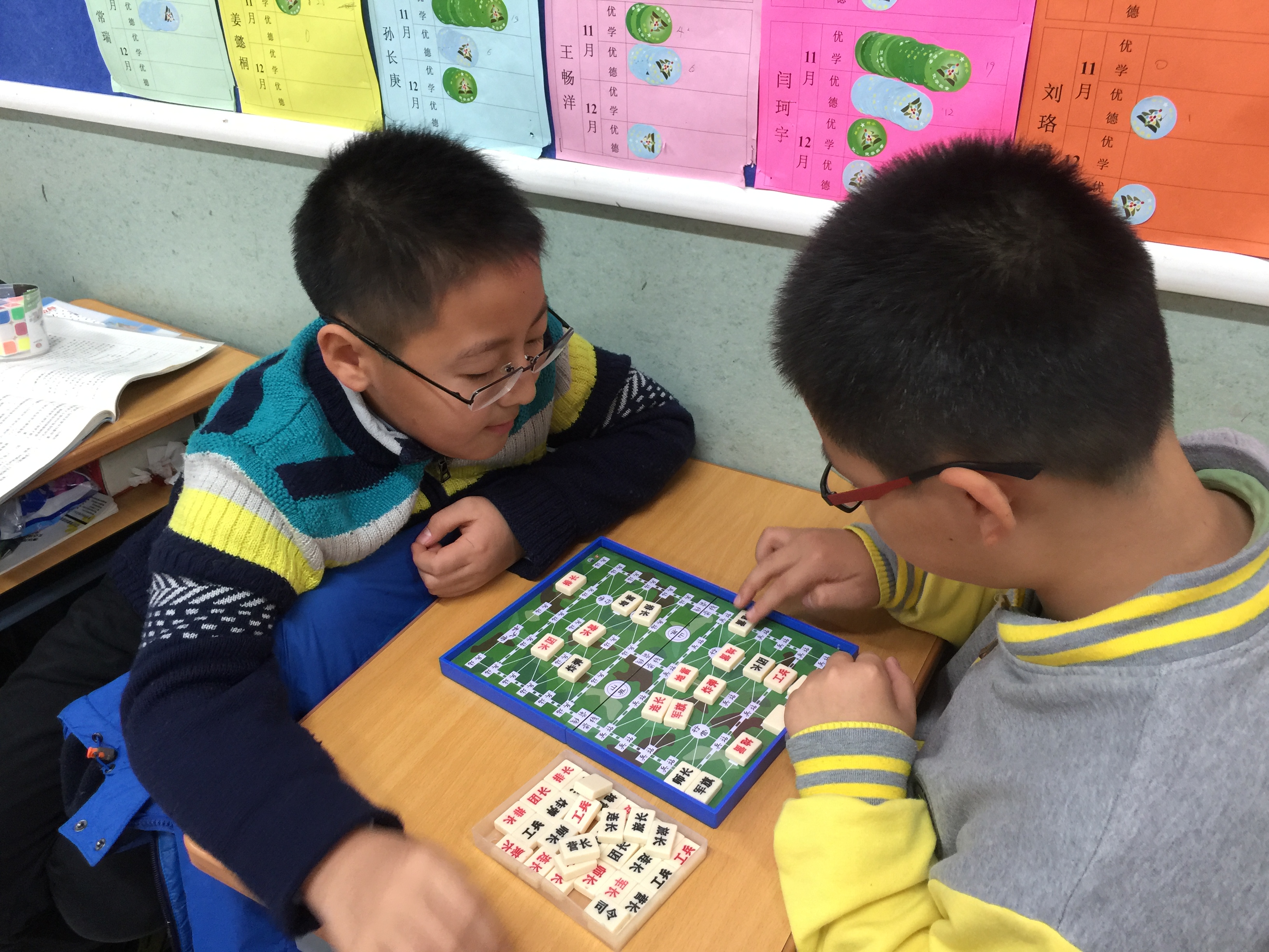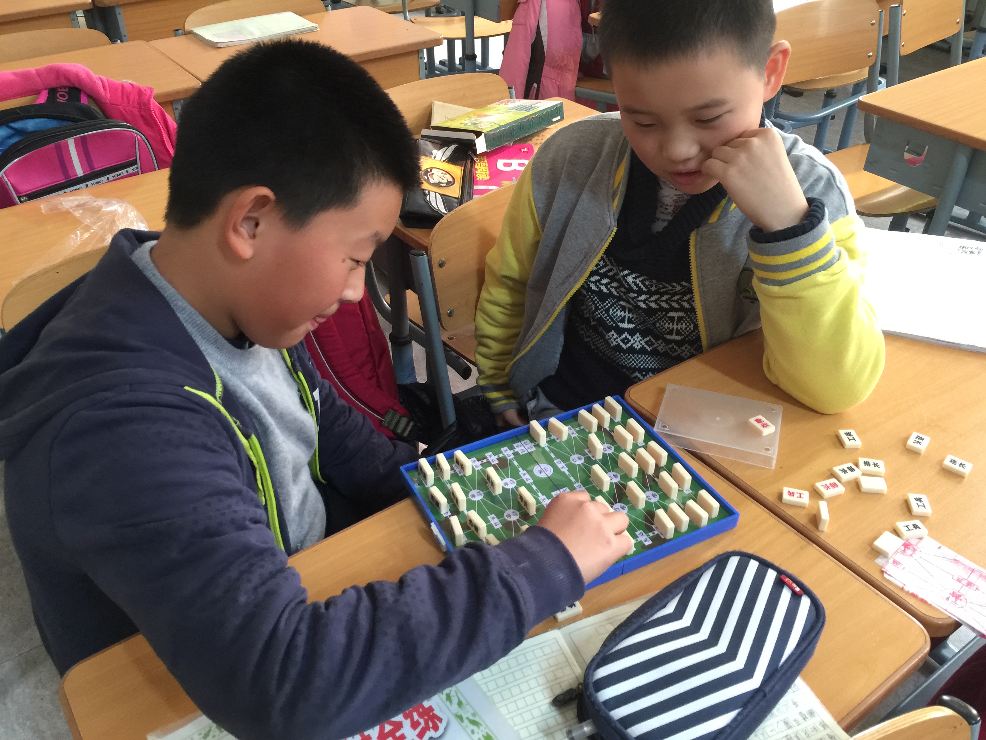 镜头二:课间十分钟,教室内的同学们照样喜笑颜开,轻松自在。有的三五成群铺开棋盘子,斗智斗勇,有的几人一组动手动脑,练习手翻绳,有的聚在一起转转魔方,相互切磋技艺......原来学校为全校13个班,又新购置了一批益智玩具,单单棋类就有跳棋、五子棋、斗兽棋、象棋、国际象棋等等好几种呢!