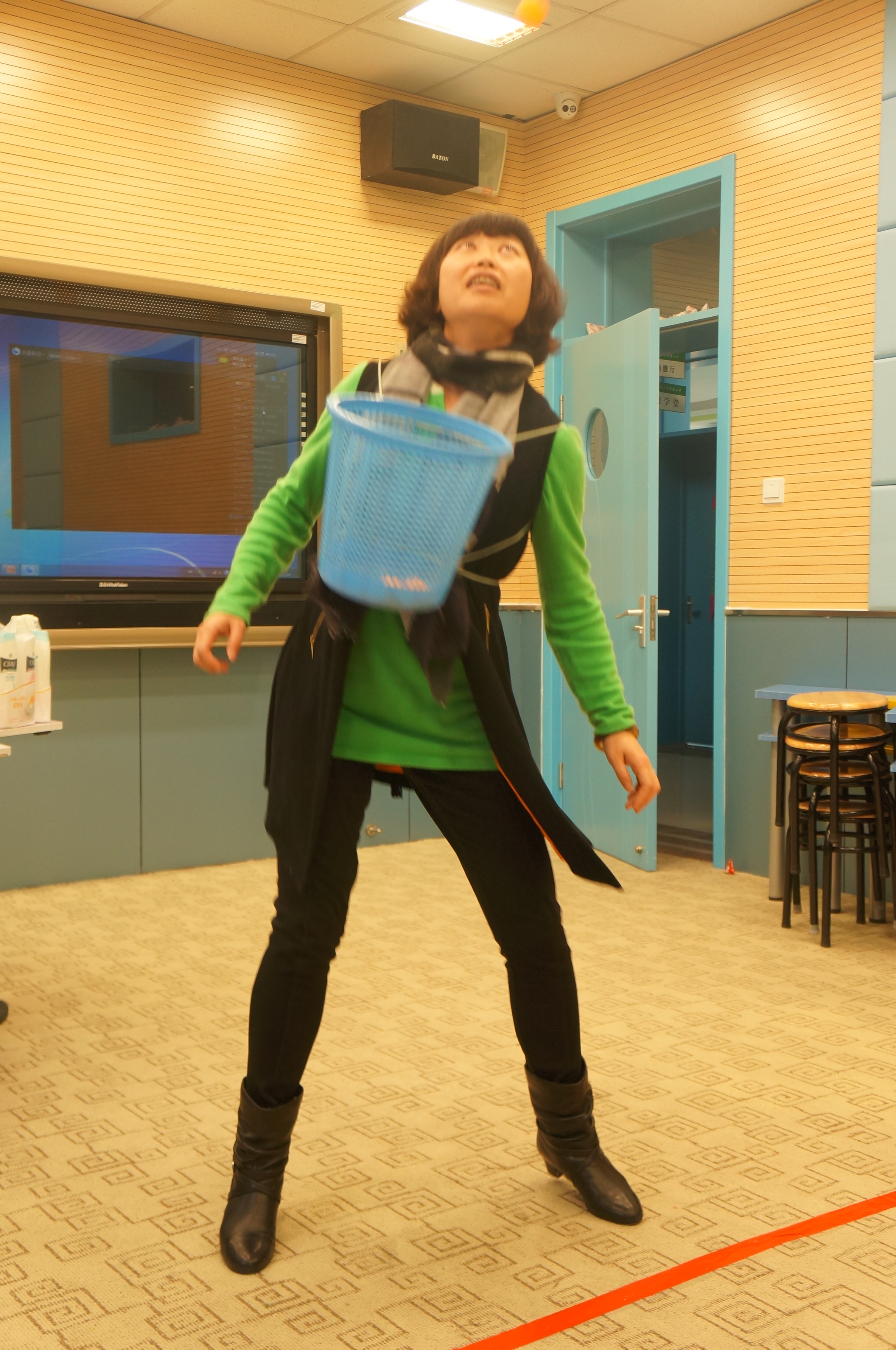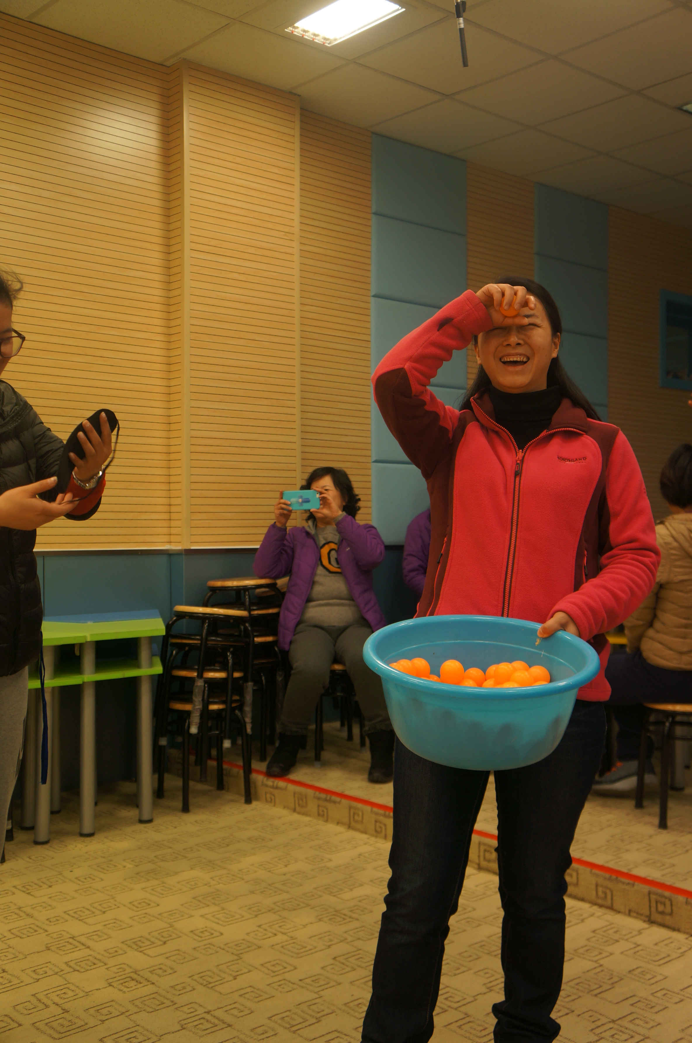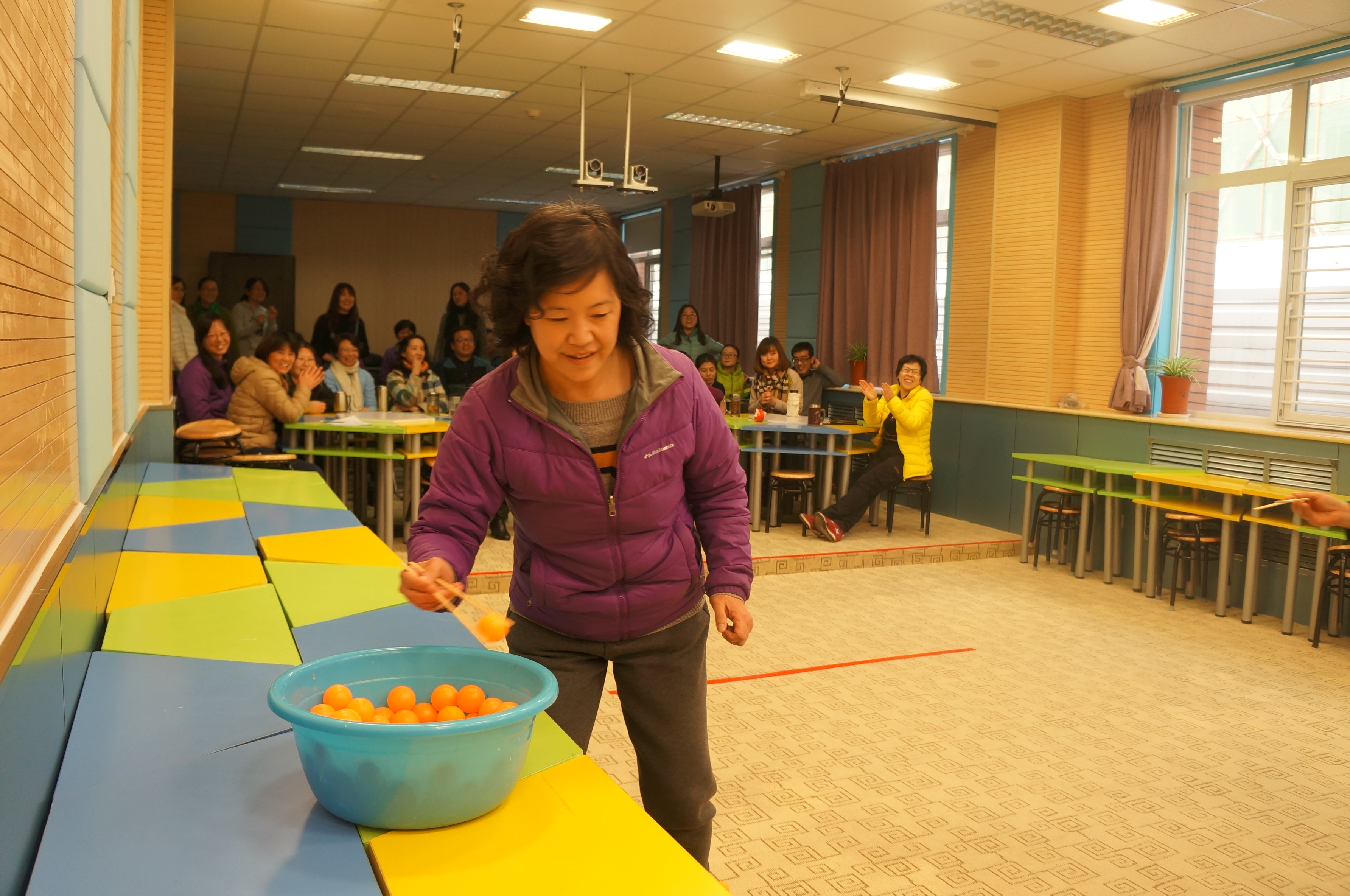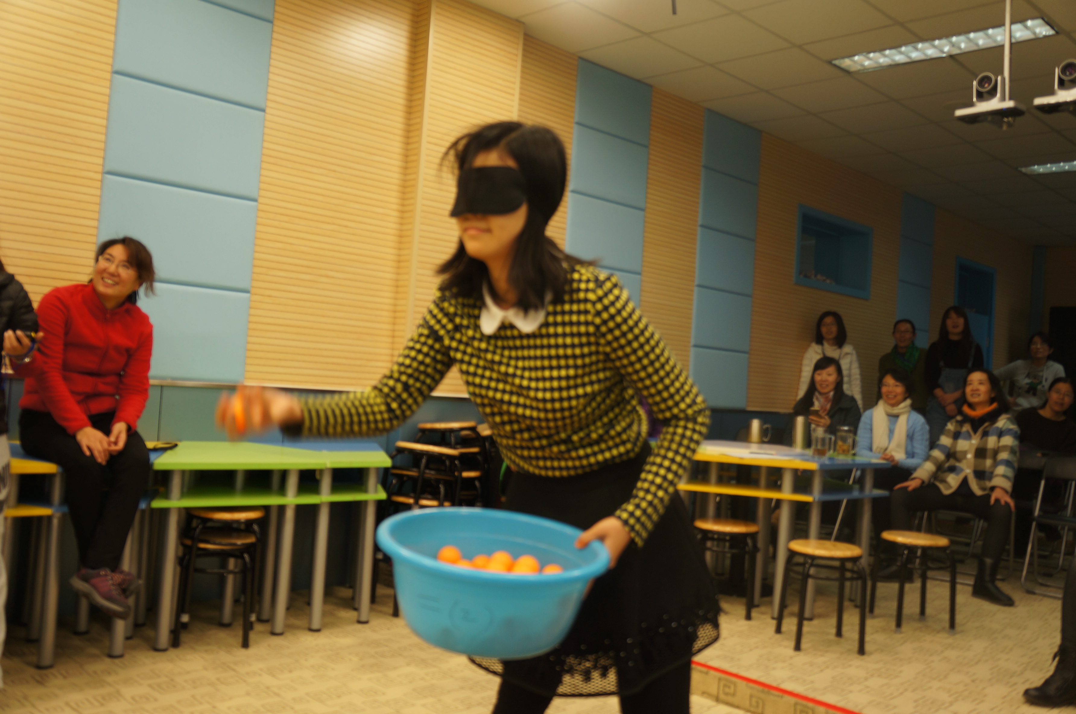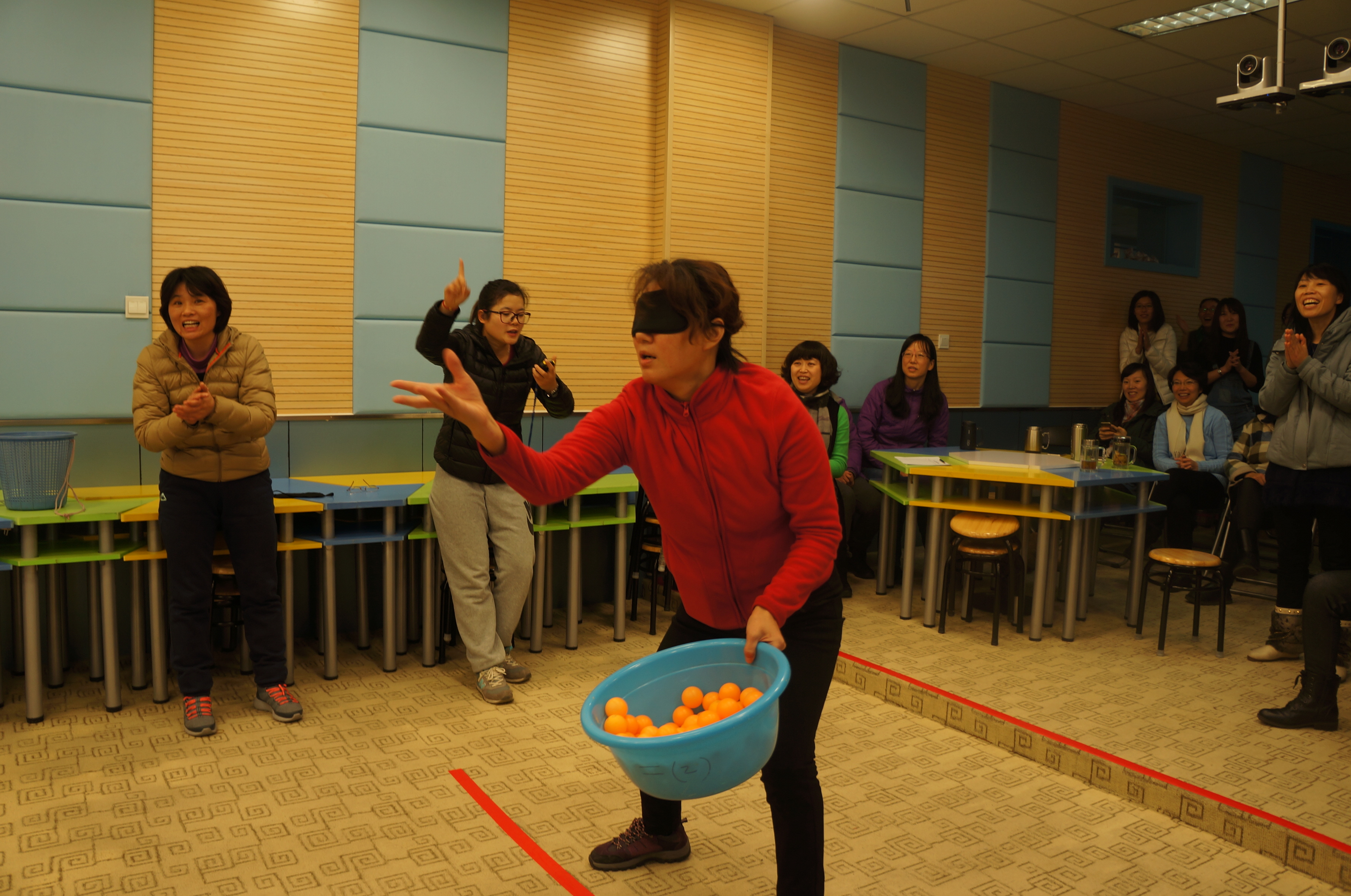 抽签分组,切磋练习,四个游戏项目,风趣幽默。老师们也是八仙过海,各显神通。你看吧,“夹乒乓球”的,有的坦然自若,不急不躁,有的手忙脚乱,欲速则不达;“蒙眼投球”的,心有灵犀一点通,竟有百发百中的神功;“疯狂来往”,比划的和猜词语的,脑洞大开,配合默契;“抖标签”的最滑稽:随着疯狂的音乐手舞足蹈,使出浑身解数……“哈哈”“哈哈哈”,老师们笑疼了肚子,笑弯了腰,场上场下乐翻了天!