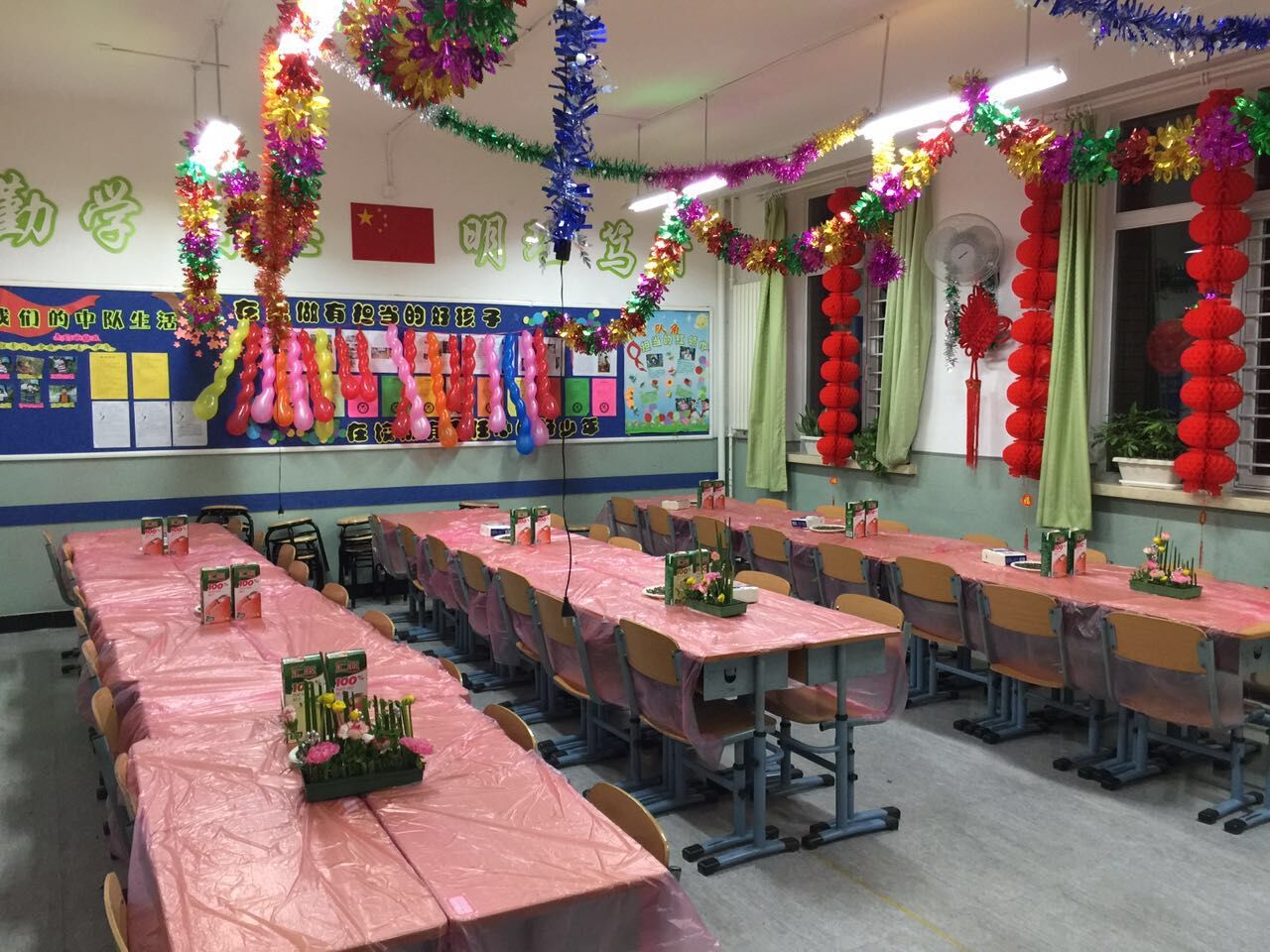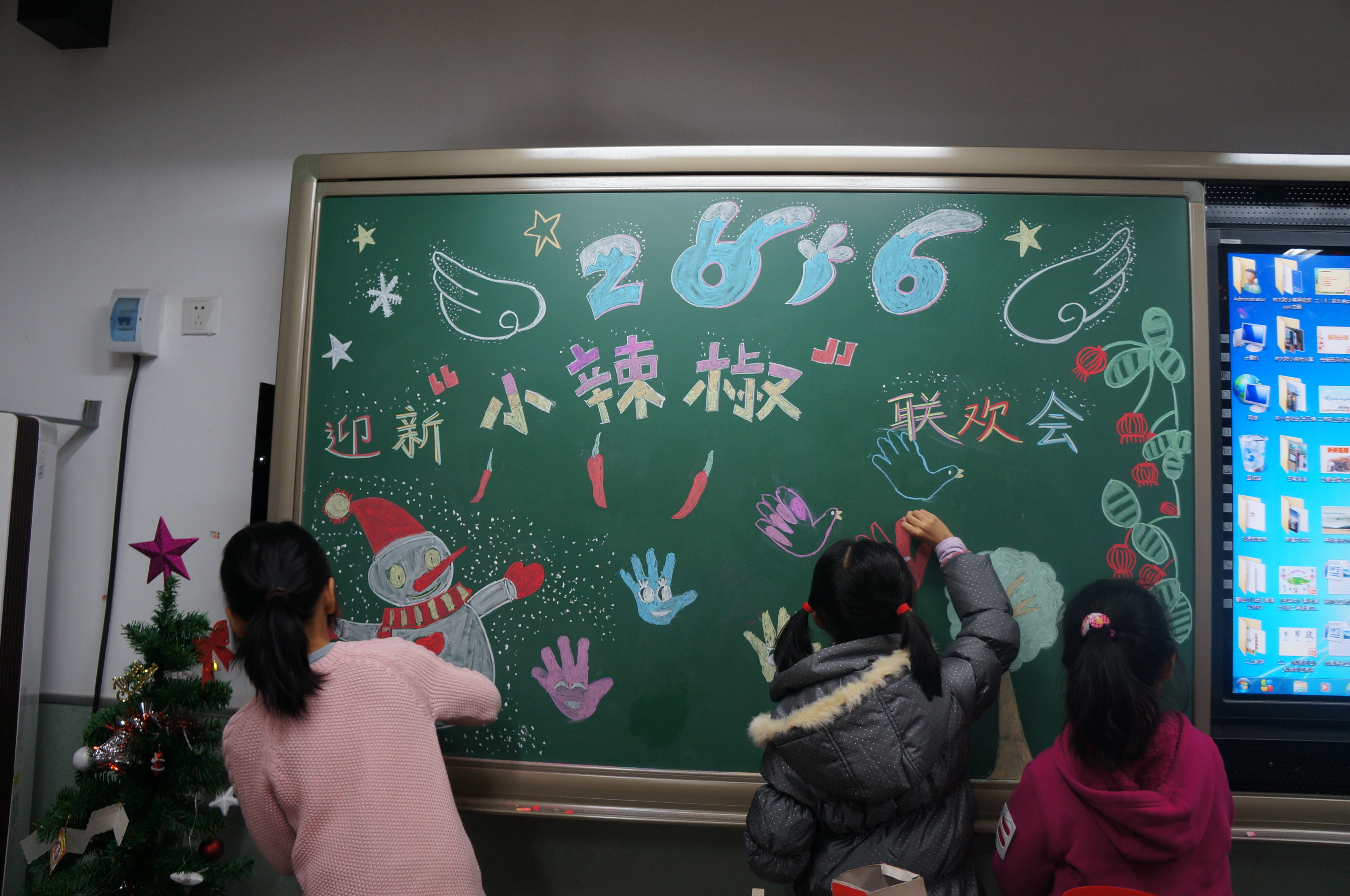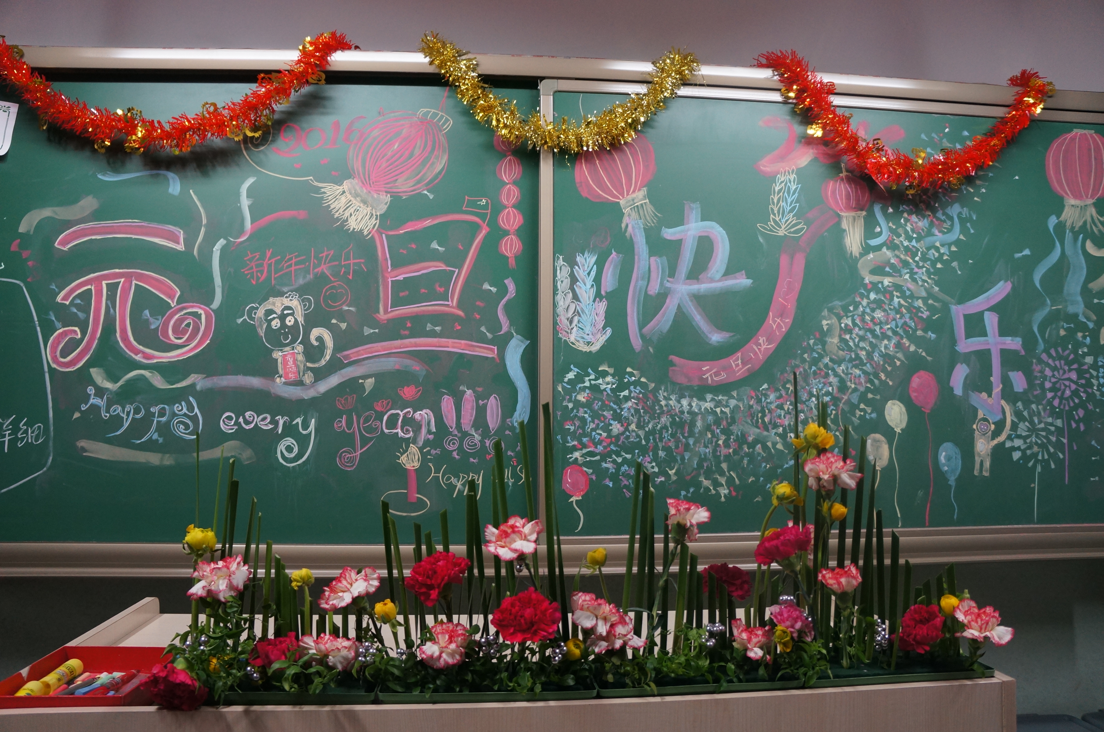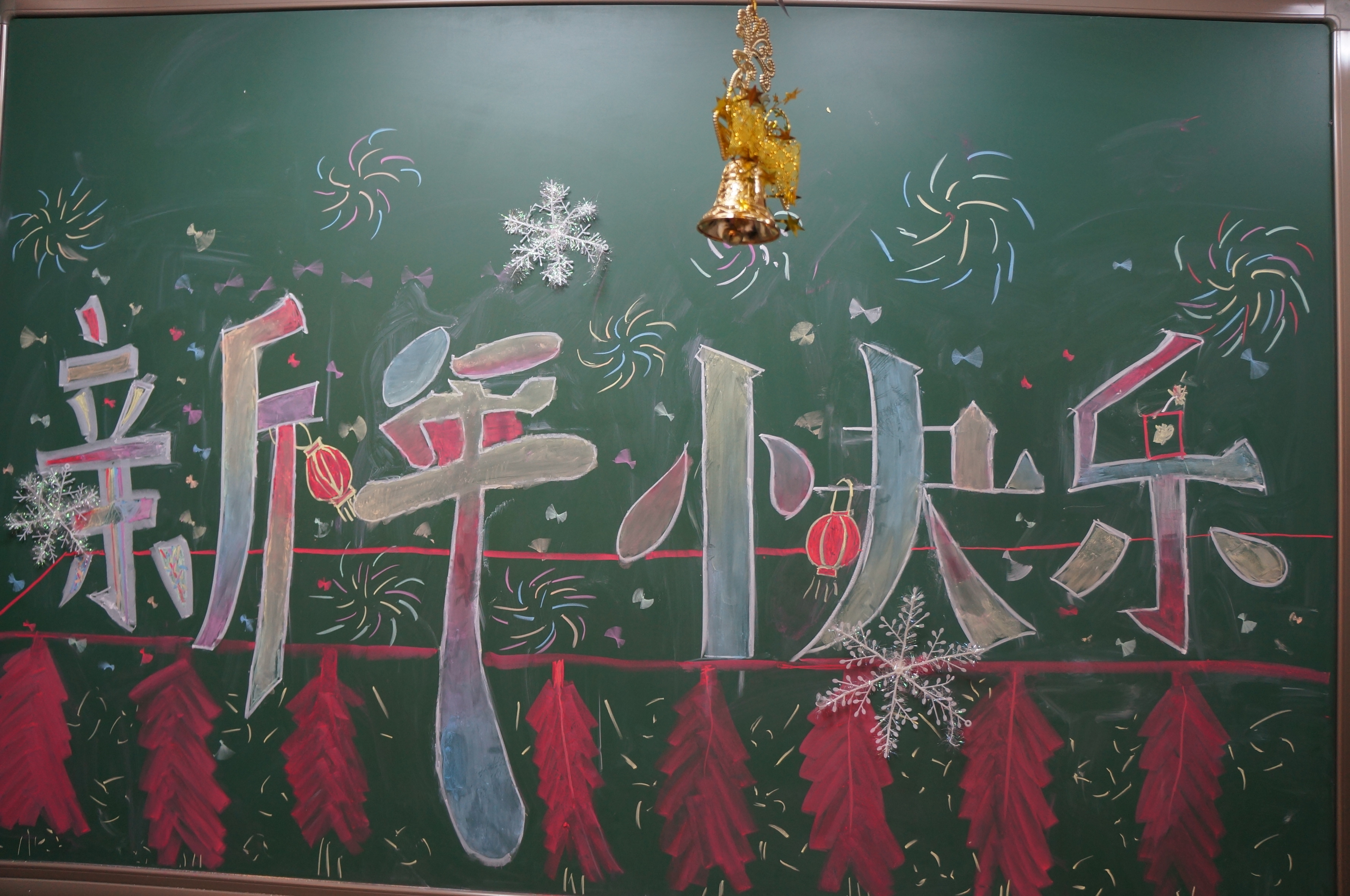 为了把教室变成欢乐的舞台,各班张灯结彩,披红挂绿。写春联,贴福字,画板报,剪窗花,挂拉花……年味浓,喜气足!老师同学齐动手,尽情装扮各自心中的舞台。创意多多的王琳老师,竟然在被白雪覆盖的操场上书写出了巨大的祝福。别具一格的装饰,增添了节日的气氛。