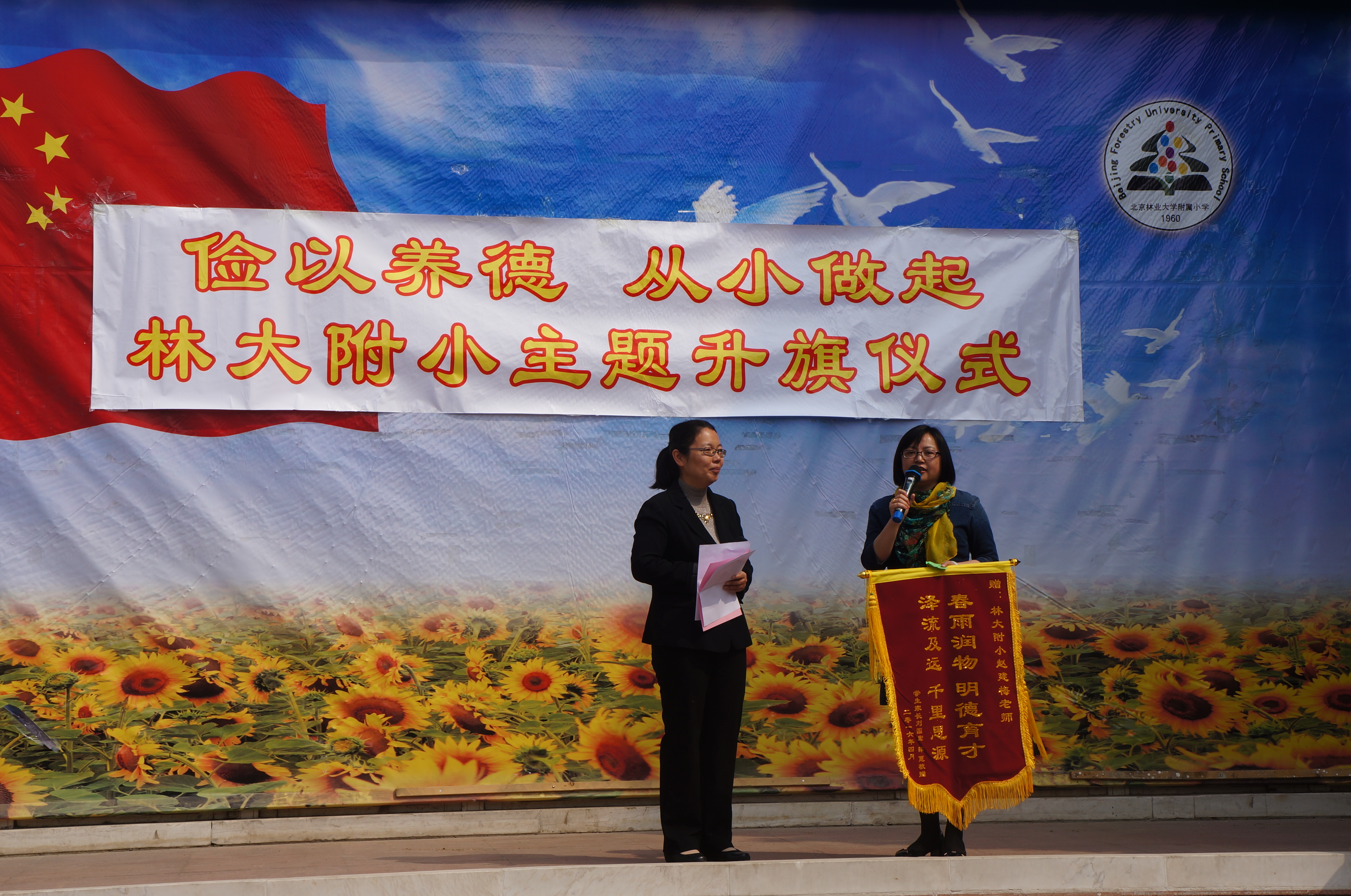4月25日上午,林大附小的升旗仪式上来了一位特殊的客人,双手拿着一面锦旗,上面写着:“春雨润物,名德育才;泽流及远,千里思源”。咦,这不是赞扬教师的语句吗?莫非是要送给林大附小老师的?仔细一看,这面锦旗原来是要送给六年级二班的赵建梅老师的。
