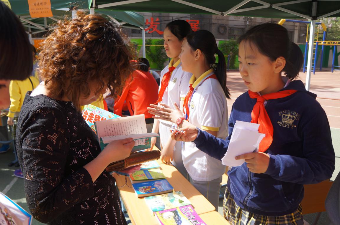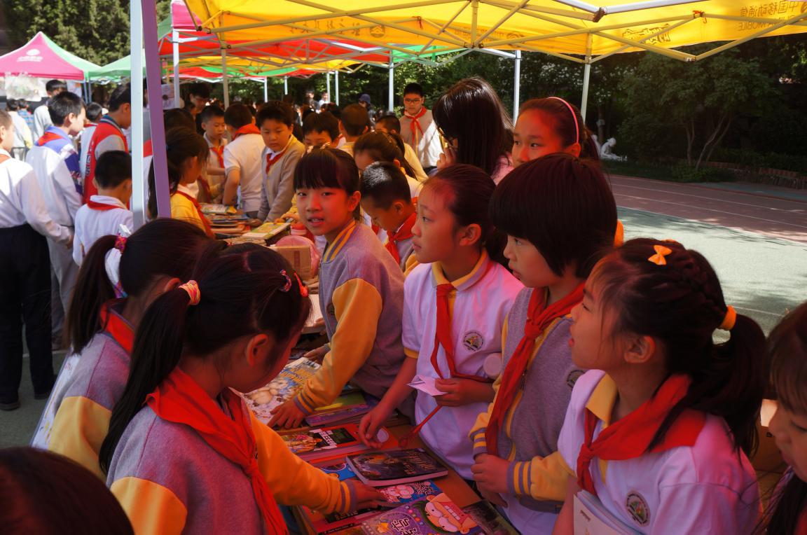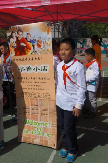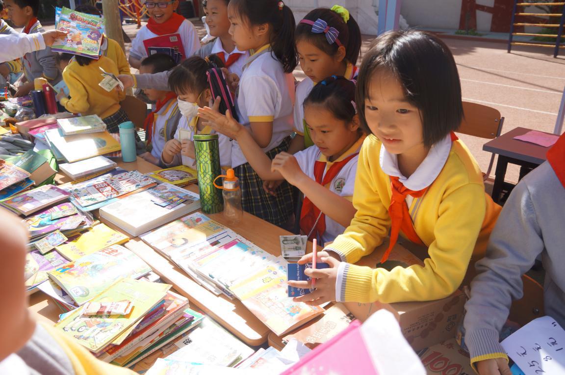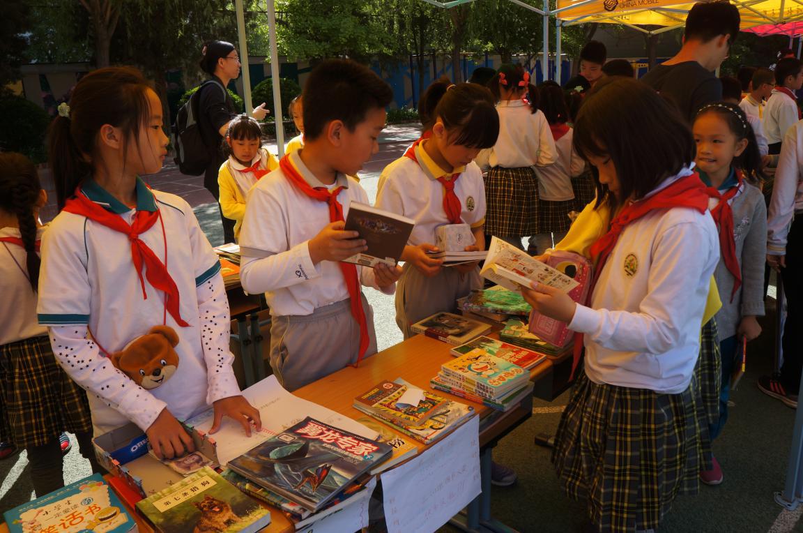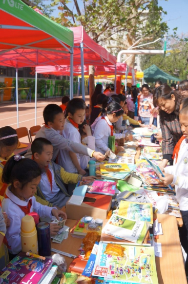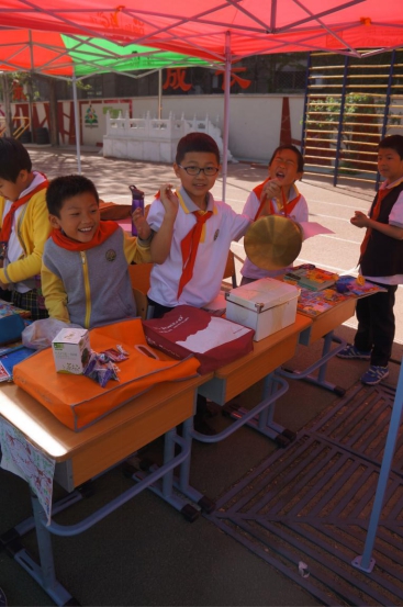 看!操场上人头攒动,同学们有的摆摊卖书,有的选购图书,有的吆喝揽客。为了招揽“顾客”,同学们使出了浑身解数。有的准备了创意十足的手绘海报,有的则喷绘打印请“明星”为自己的书摊代言,有的不惜“牺牲”自身形象敲锣打鼓、唱歌跳舞......