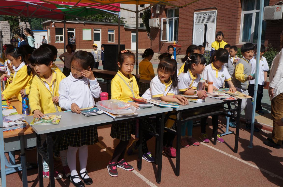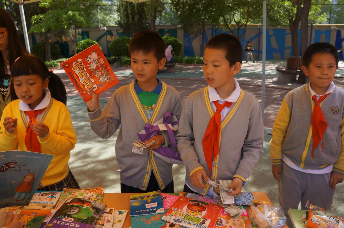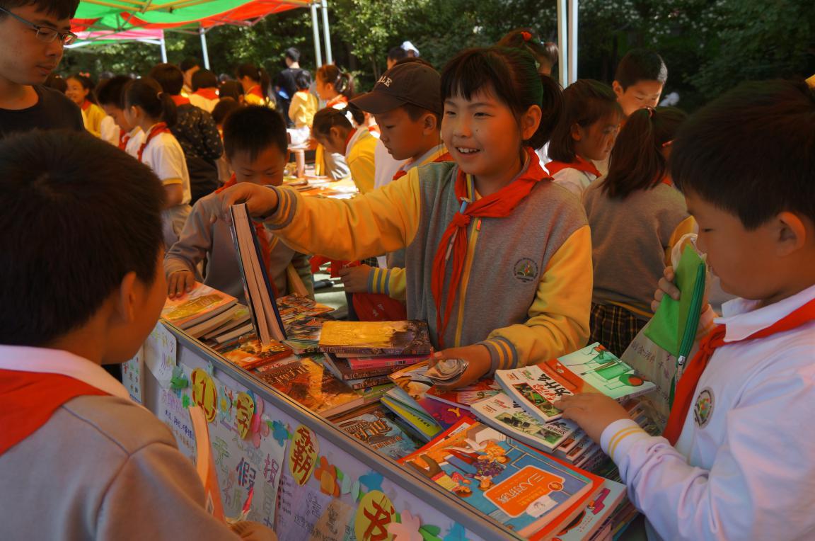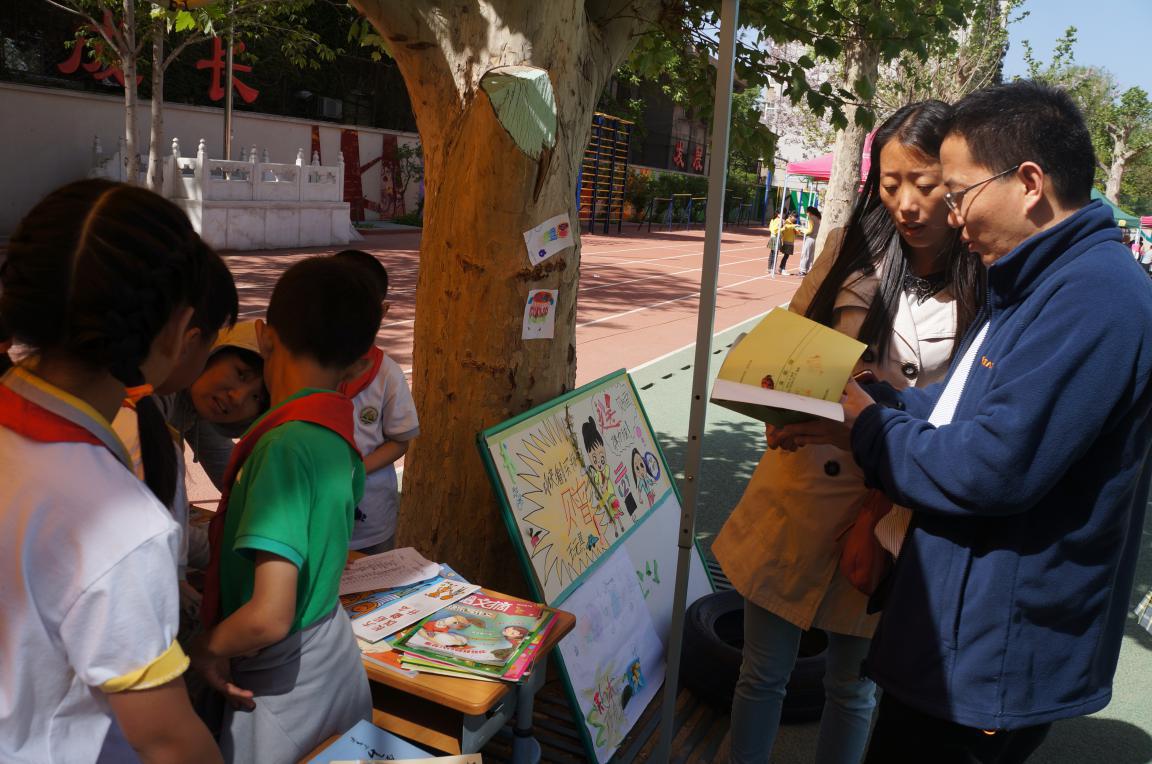 看!操场上人头攒动,同学们有的摆摊卖书,有的选购图书,有的吆喝揽客。为了招揽“顾客”,同学们使出了浑身解数。有的准备了创意十足的手绘海报,有的则喷绘打印请“明星”为自己的书摊代言,有的不惜“牺牲”自身形象敲锣打鼓、唱歌跳舞......