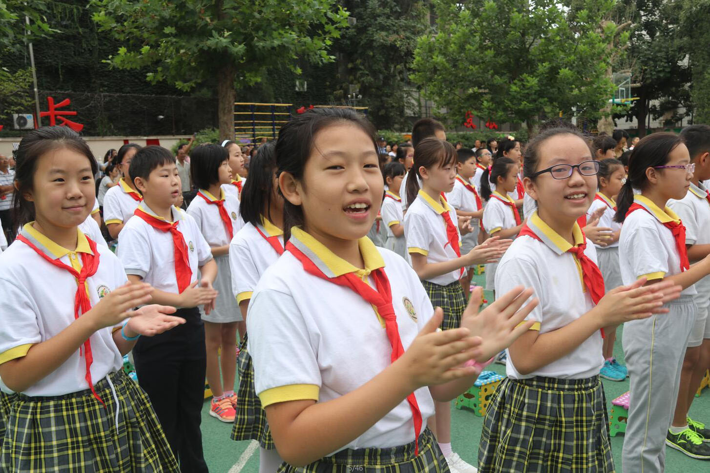 校园里最吸引人目光的就是一年级的新同学们。瞧!他们在全校师生的热烈欢迎下,挥舞着稚嫩的小手,踏着轻快的脚步,用欢快的声音高喊着:“大哥哥、大姐姐,我们来啦!”