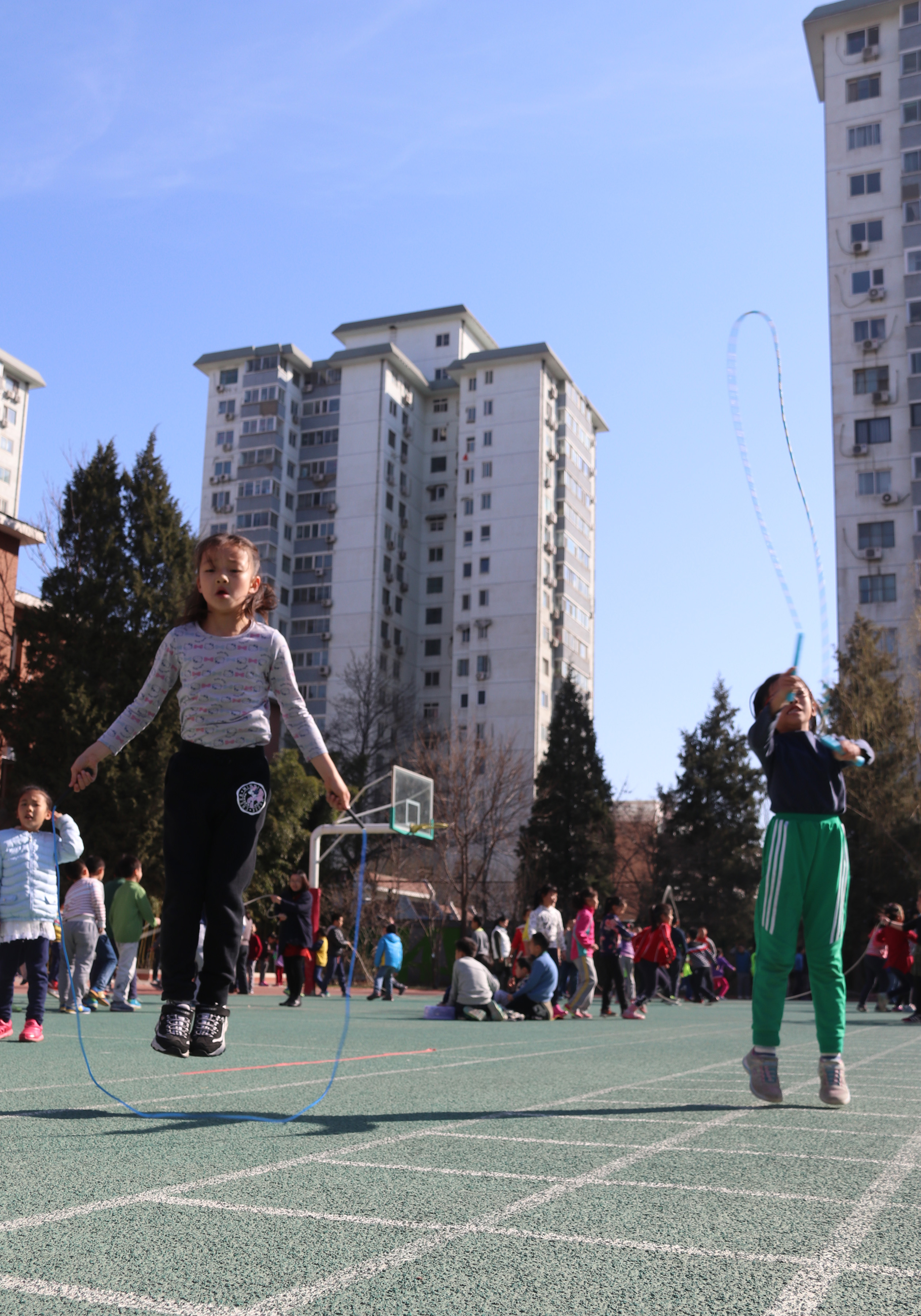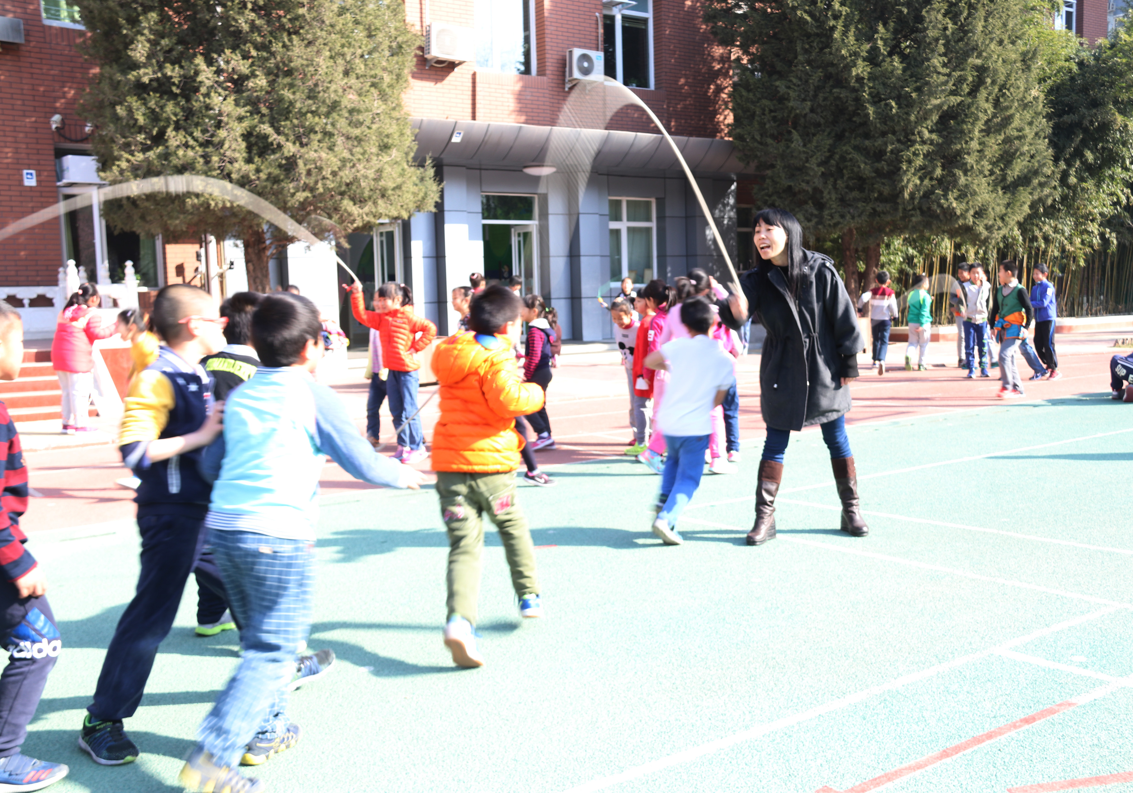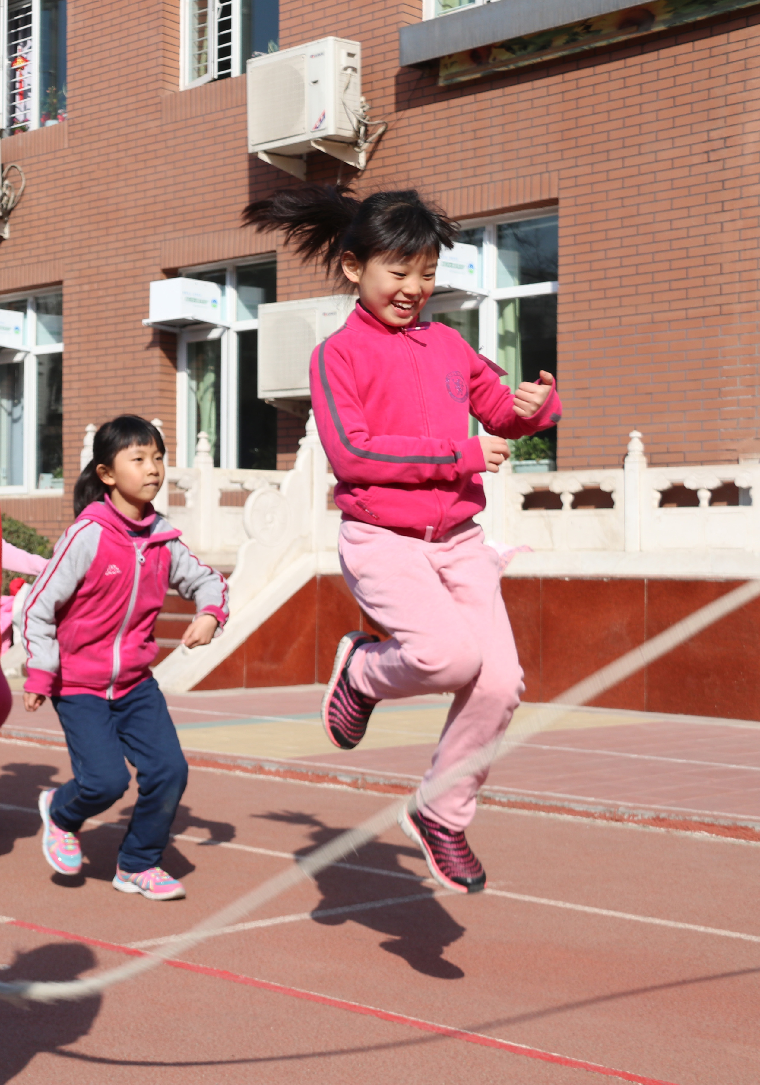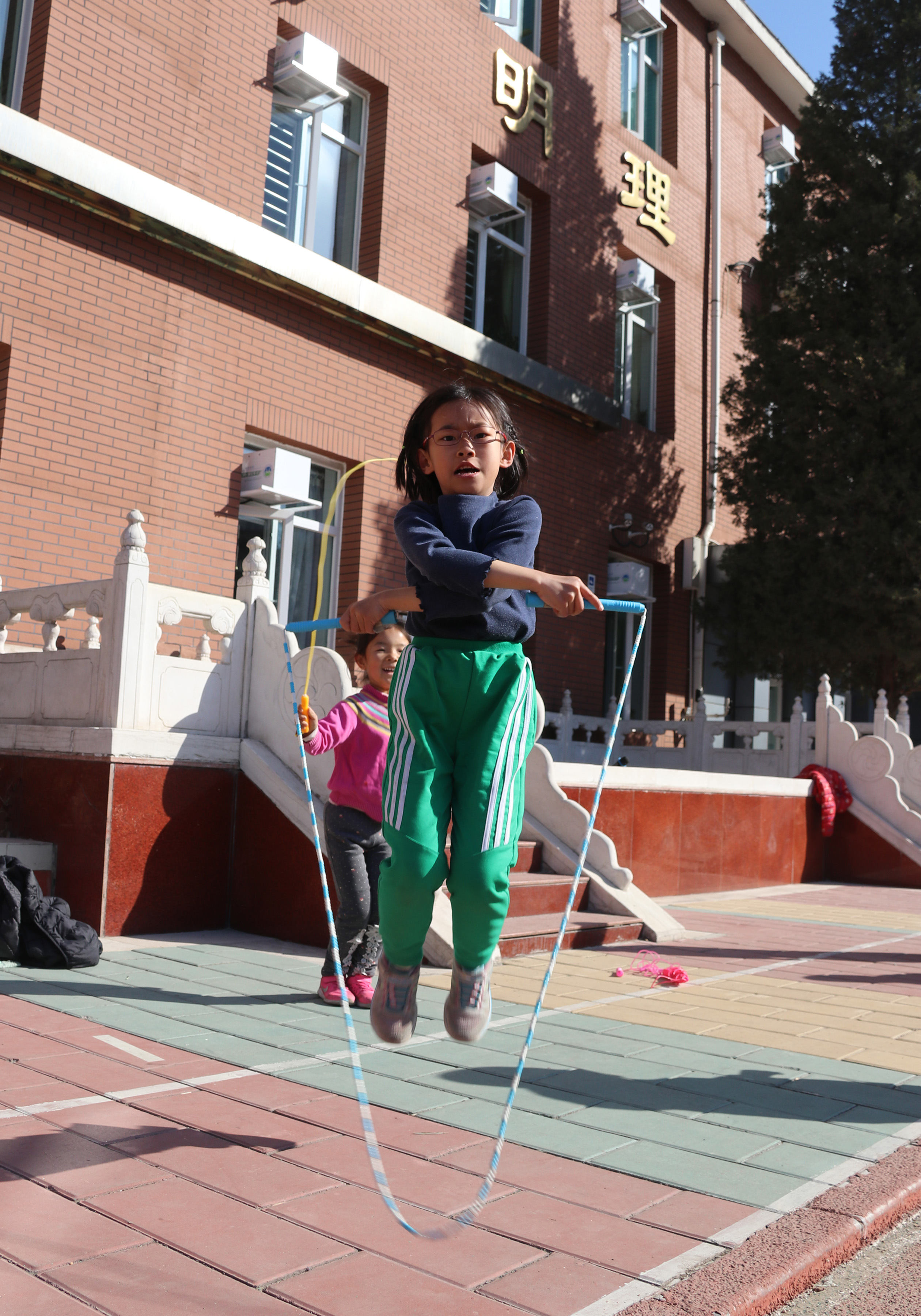 孩子们跳跃着双脚,挥动着双臂,脚尖与地面的摩擦谱出一曲动听的乐章,手中的跳绳在空中舞出一条优美的弧线。整个操场无比欢腾,“绳”彩飞扬。