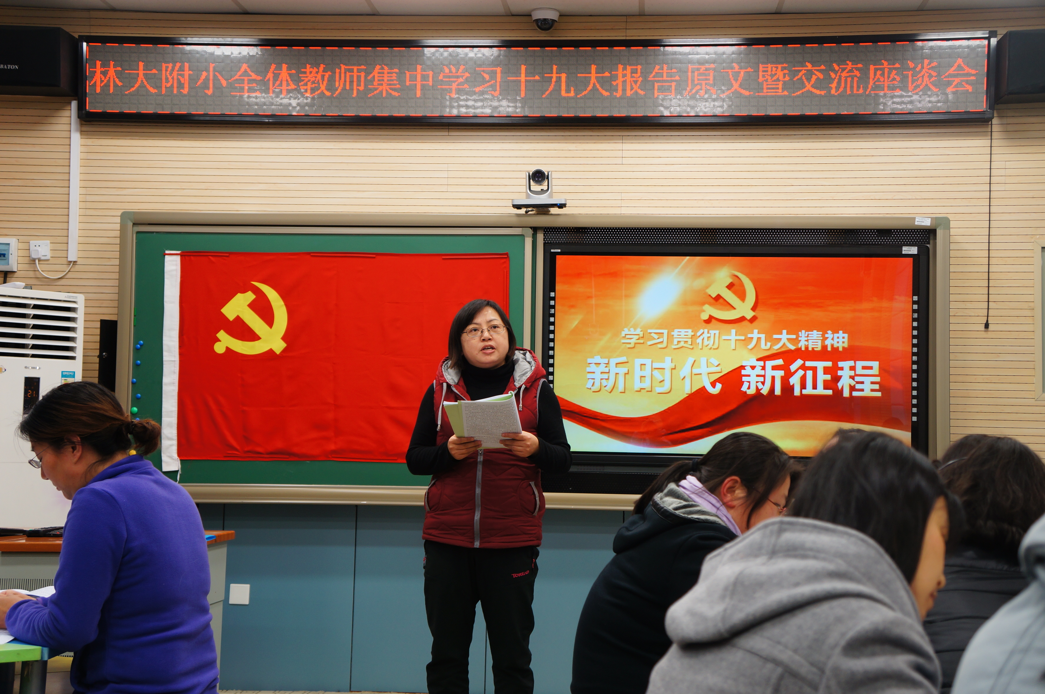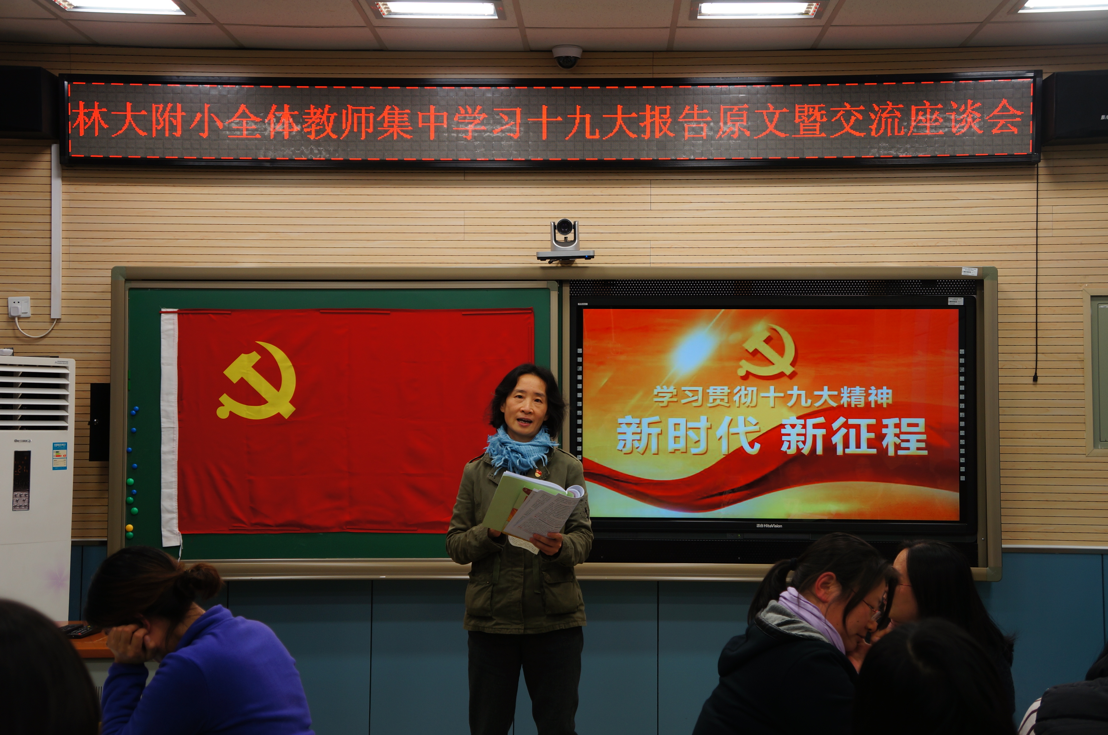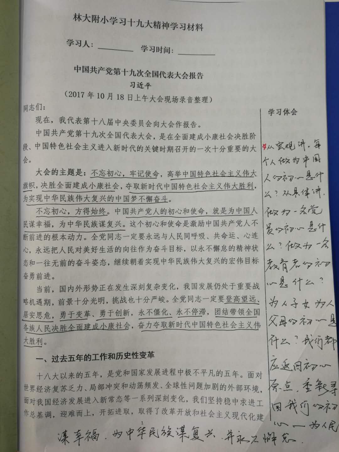 为深入了解十八大以来中国发生的翻天覆地变化,深入学习十九大的会议精神,11月4日上午,林大附小直属党支部组织全体教师参观“砥砺奋进的五年”大型成就展。并于下午学习“十九大报告”原文,在学习手册中旁批学习感受。11月6日下午,组织全体教师召开座谈会,集中学习“十九大报告”并交流学习体会。
